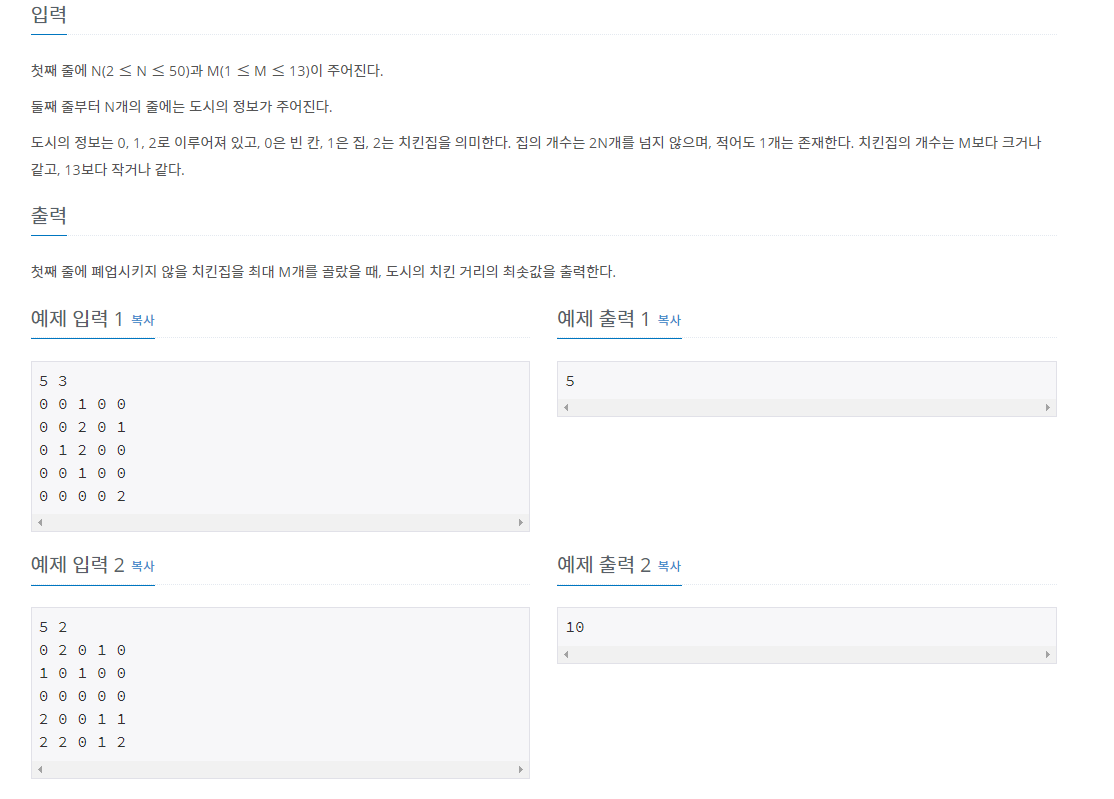 최소 도시치킨거리를 갖는 치킨집 개수 M을 구하라고 한다면 부분집합으로 문제를 풀어야 한다고 생각합니다.)