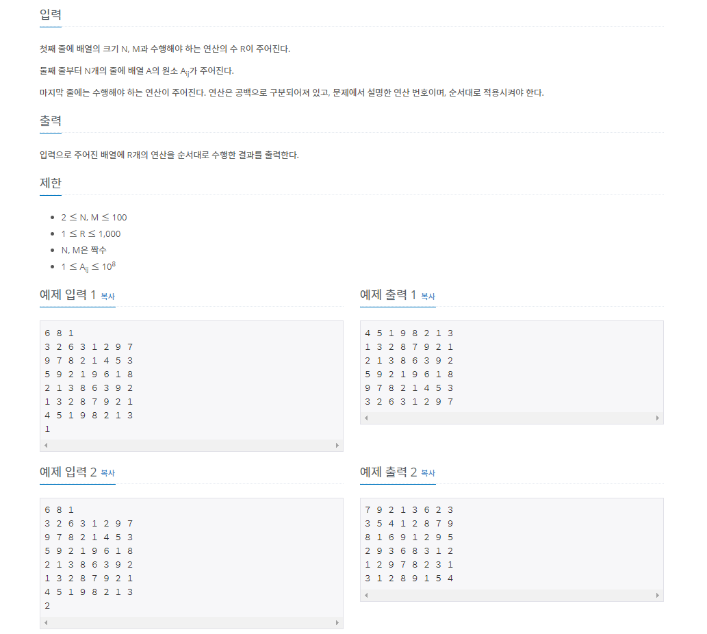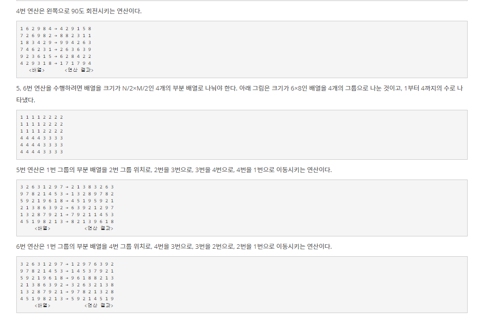 크기가 N×M인 배열이 있을 때, 배열에 연산을 R번 적용하려고 한다. 연산은 총 6가지가 있다. 1번 연산은 배열을 상하 반전시키는 연산이다. 1 6 2 9 8 4 → 4 2 9 3 1 8 7 2 6 9 8 2 → 9 2 3 6 1 5 1 8 3 4 2 9 →