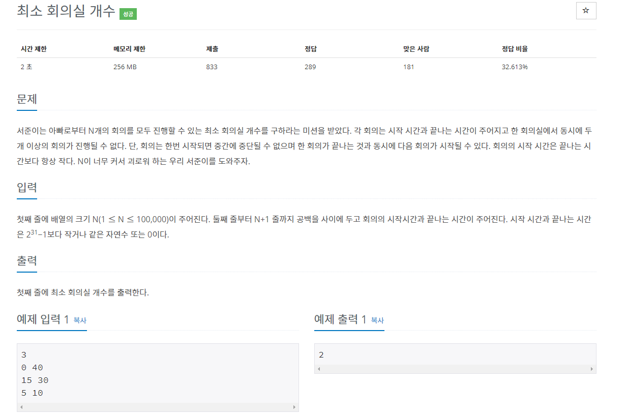 # 가장 빨리 끝나는 회의를 찾아 교대 할지 새로 추가할지 판단.
